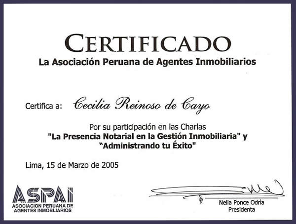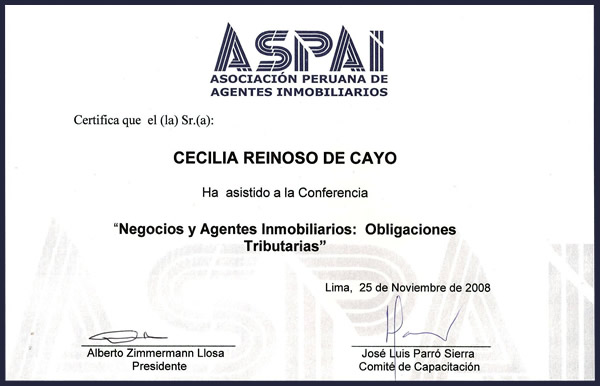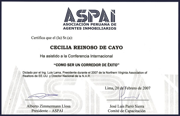 Como Gerente General de la empresa Soy Asociada de ASPAI con el Nº 95 (ASOCIACION PERUANA DE AGENTES INMOBILIARIOS), Me siento orgullosa de haber compartido mi experiencia y haber colaborado como miembro de la Directiva 2007 al 2008, He participado en varios eventos relacionados al Agente Inmobiliario, el principal fue realizado en la ciudad de ORLANDO EEUU en el mes de Noviembre 2008 La conferencia fue REALTORS NATIONAL ASSOCIATION CONFERENCE & EXPO INTERNATIONAL NOVEMBER 04 – NOVEMBER al 10- 2008, se cumplieron los 100 años de los REALTORS, donde compartimos experiencia con otros Agentes Inmobiliarios de todo el mundo, tuve la alegría de firmar el CONVENIO ASPAI PERU (Asociación Peruana de Agentes Inmobiliarios) y la NAR (National Association Of Realtors) EEUU.